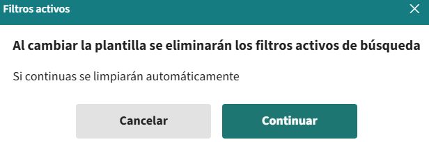 💡 Tip: Si se cambia de plantilla con filtros activos, se visualiza un pop-up de confirmación para evitar perder los filtros aplicados.
