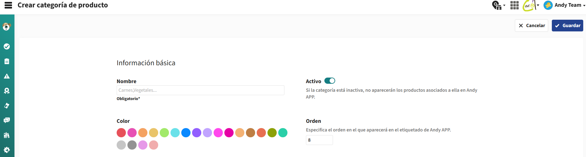 Seguidamente, te aparece la siguiente pantalla, en la que debes dar un Nombre a la categoría, asignar un Color y especificar el Orden en el que aparecerá: