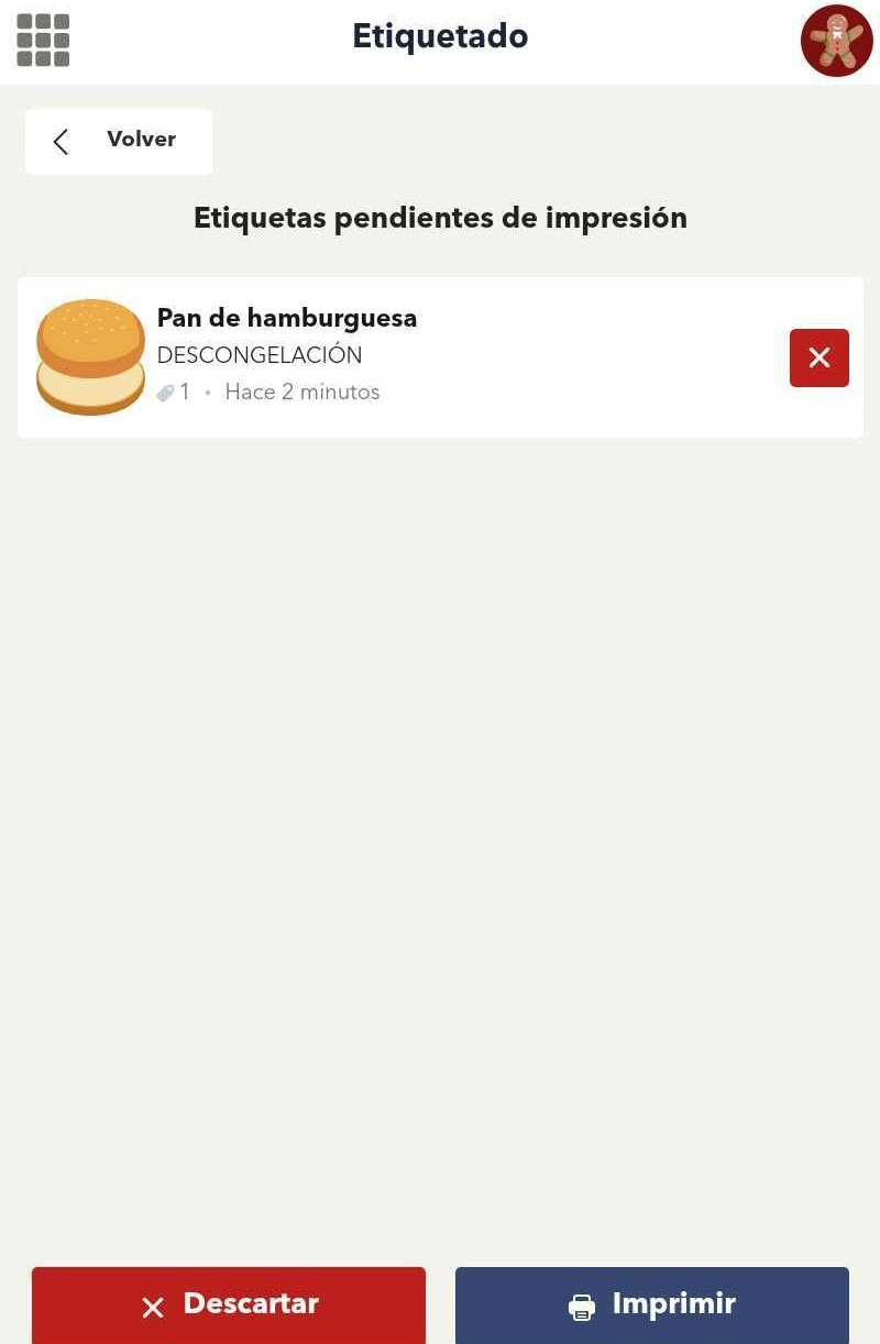 7- Ahora te encuentras en la Cola de impresión, en la que verás todos los productos seleccionados a etiquetar. Aquí puedes Descartar todas las etiquetas, eliminar una en concreto pulsando en X o bien, una vez tengas conexión con la impresora, pulsar en Imprimir para que se impriman una detrás de otra.
