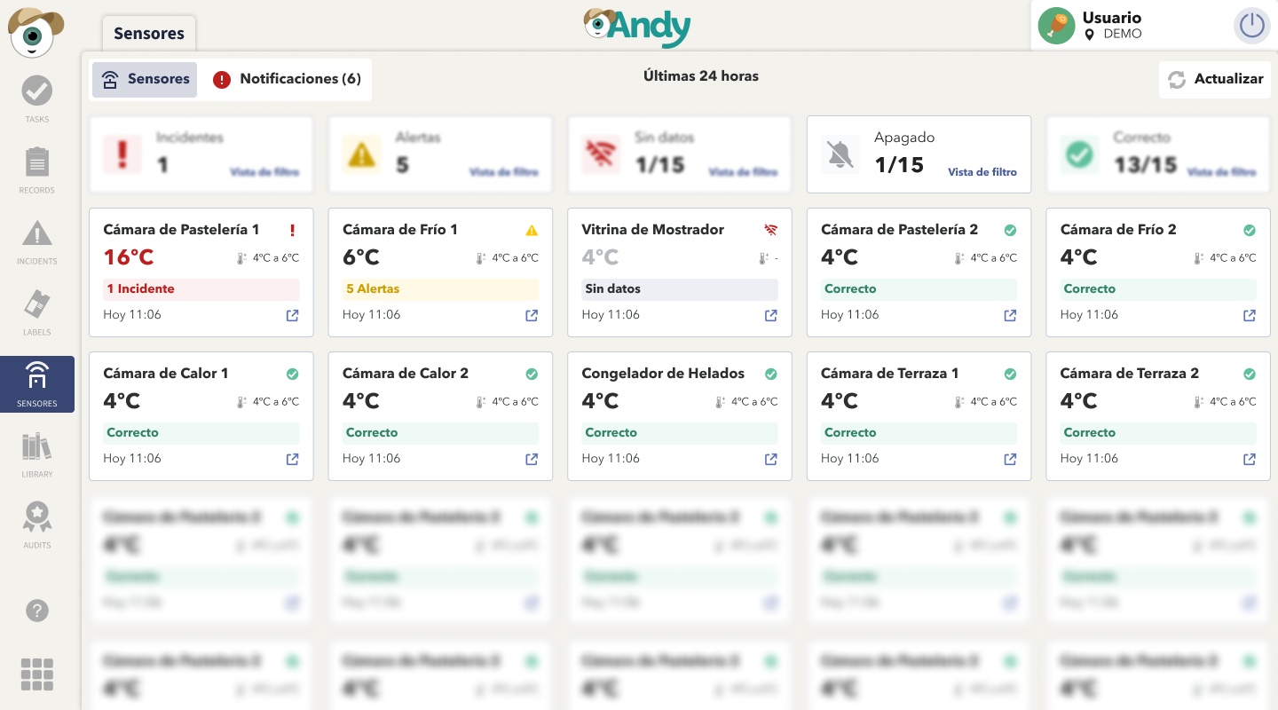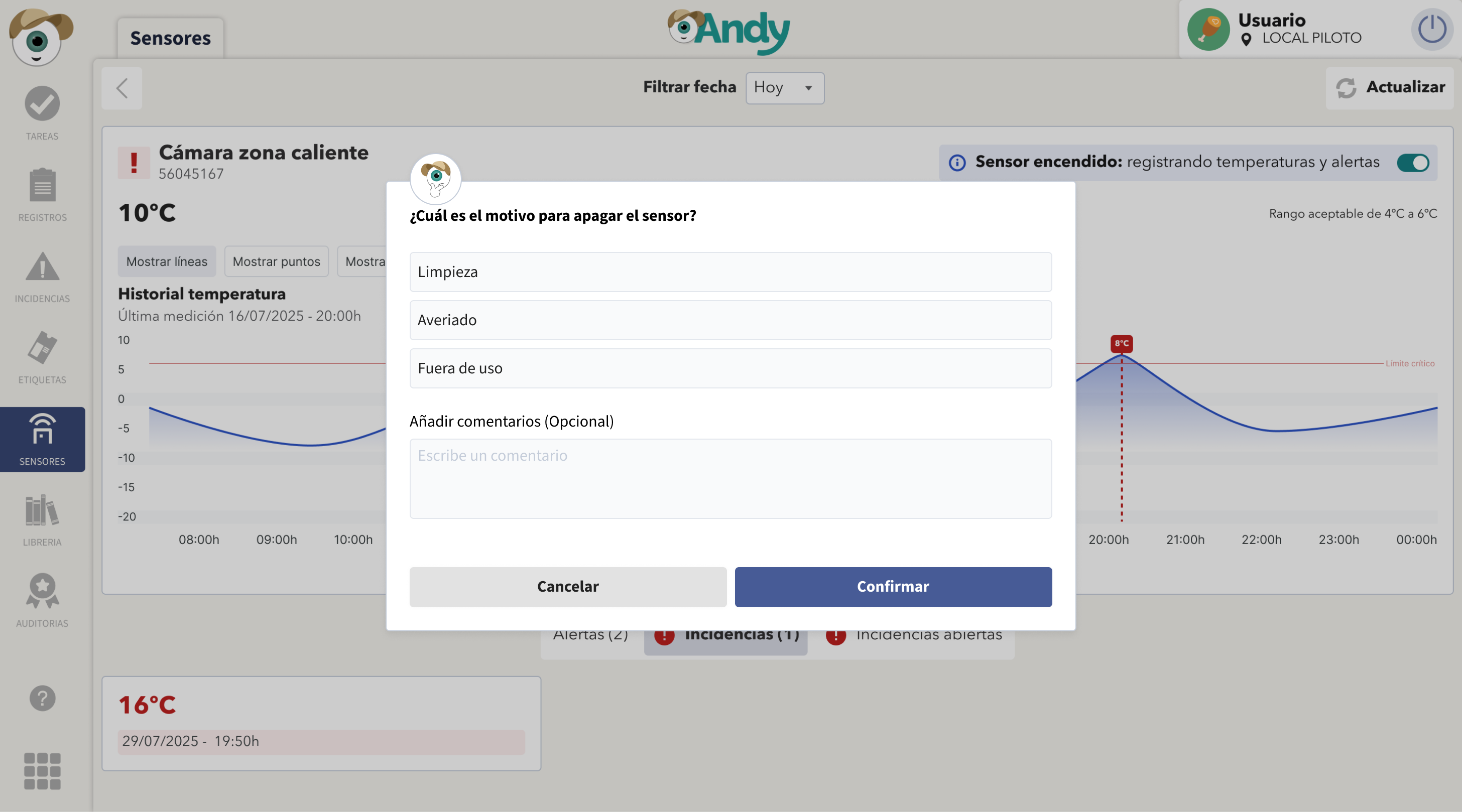 El apagado de sensores es una funcionalidad que permite desactivar temporalmente sensores directamente desde Andy APP, evitando que generen alertas e incidencias mientras se encuentren apagados.
