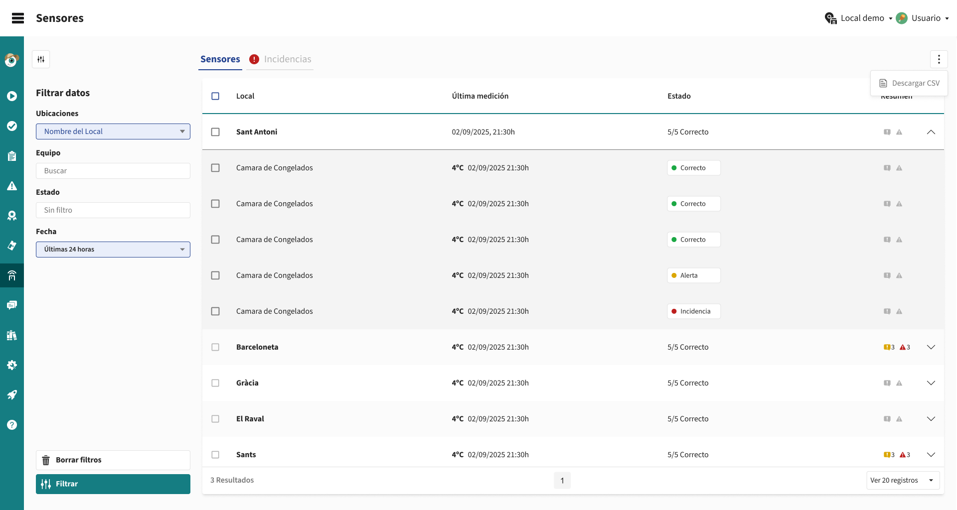 Dentro del Panel de Control, es posible visualizar el listado de sensores agrupados por local, mostrando los valores actuales de temperatura.