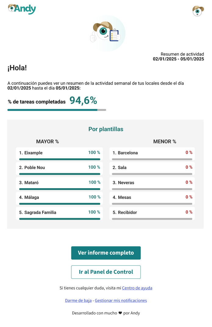 Una funcionalidad de Andy que permite recibir vía correo electrónico un resumen de las tareas no cumplimentadas en tus locales. Para ello, es posible configurar la frecuencia desde el Panel de Control y mantener un seguimiento actualizado sin entrar en la plataforma.