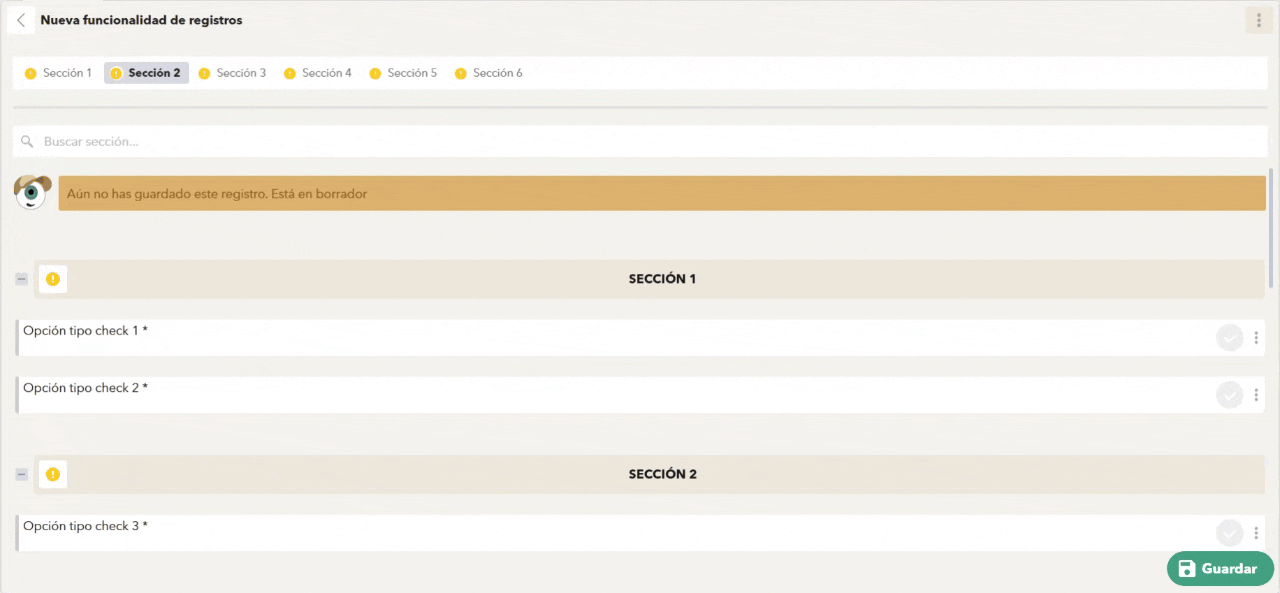 Un conjunto de mejoras en la gestión de registros que facilita retomar y completar plantillas extensas. Incluye indicadores visuales, buscador de secciones, barra de progreso y acceso rápido a lo pendiente.